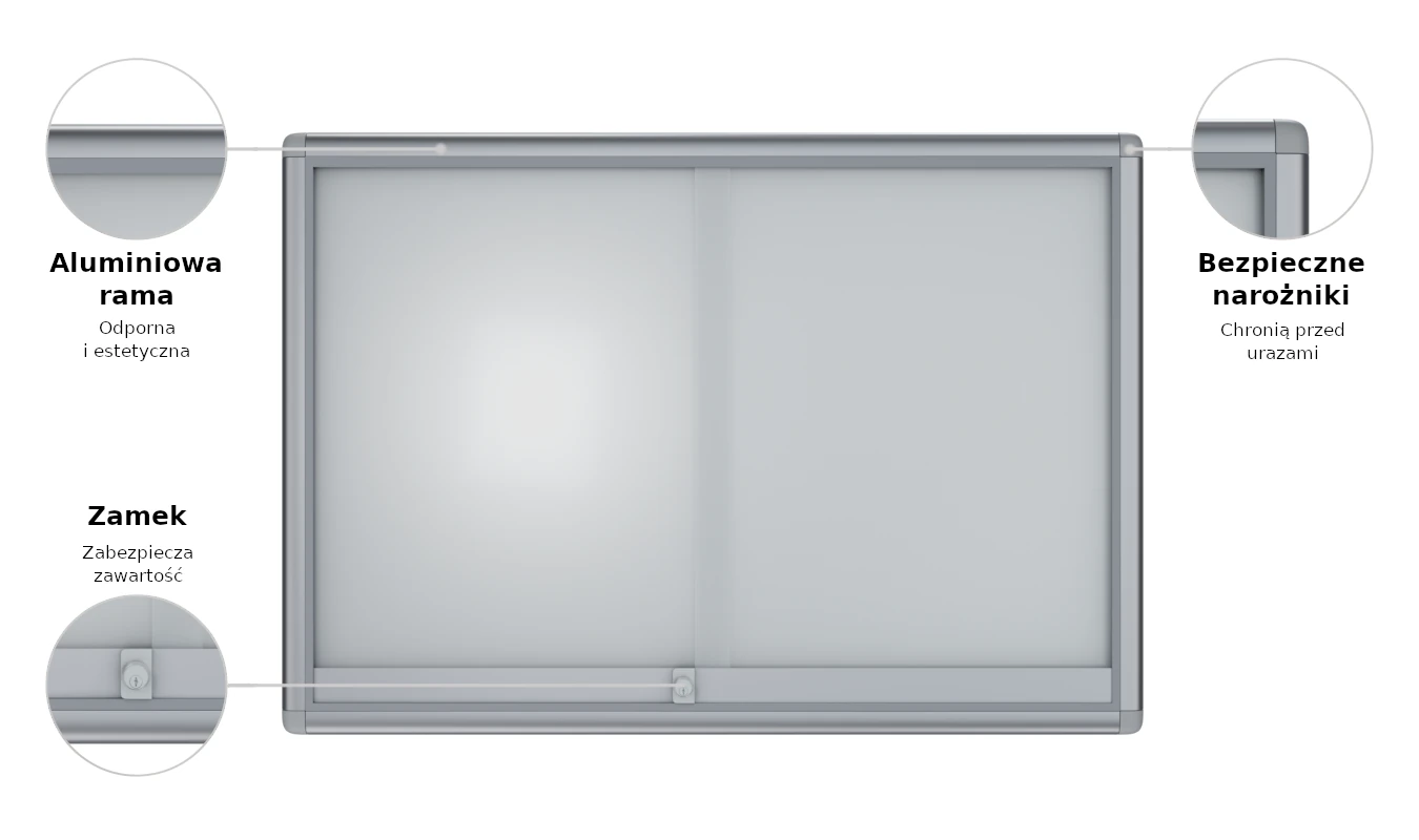 Każda z naszych gablot wykonana jest w taki sposób, aby zapewniała maksymalne bezpieczeństwo. Dlatego ich przesuwane drzwi są wykonane ze szkła hartowanego, które jest ponad 7-krotnie bardziej wytrzymałe niż standardowe. Nawet jeśli dojdzie do jego rozbicia, to rozpadnie się na nieostre kawałki. Jest to szczególnie istotne dla gablot, które zamontowane są w miejscach publicznych, jak uczelnia, placówki oświatowe czy urzędy.