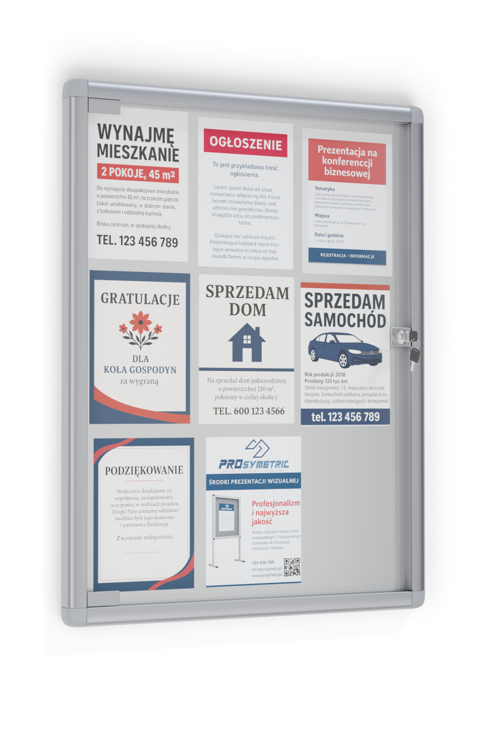 Nasze gabloty wyróżniają się najwyższym standardem na rynku. W naszej ofercie znajduje się m.in. ścianka ekspozycyjna, witryna sklepowa czy też gablota wewnętrzna wolnostojąca. To właśnie gabloty wewnętrzne są idealne do biur, urzędów, szkół i innych miejsc, w których trzeba przekazywać informacje. Gabloty i tablice przeznaczone są również do budynków mieszkalnych, w których umożliwiają sprawną komunikację spółdzielni z mieszkańcami. Oczywiście dostęp do zawartości gabloty może zostać ograniczony, gdy zamontujemy w niej zamek.