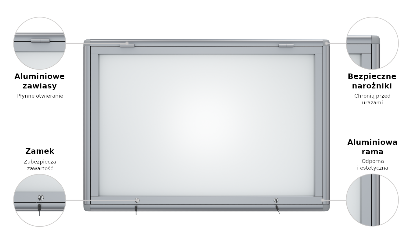 Gablota wykonana jest z profili aluminiowych co zapewnia trwałość i nowoczesny wygląd. Jednak design gabloty może zostać dodatkowo podkreślony poprzez zamontowanie oświetlenia LED lub fryzu. Nie ma znaczenia, czy gablota będzie znajdowała się w pomieszczeniach zamkniętych, jak klatki schodowe, czy będzie to gablota otwierana zewnętrzna – oświetlenie LED zawsze dobrze wygląda. Z kolei szyld (fryz) polecamy urzędom i szkołom, ale także firmom, które mogą na nim umieścić swoje logo.