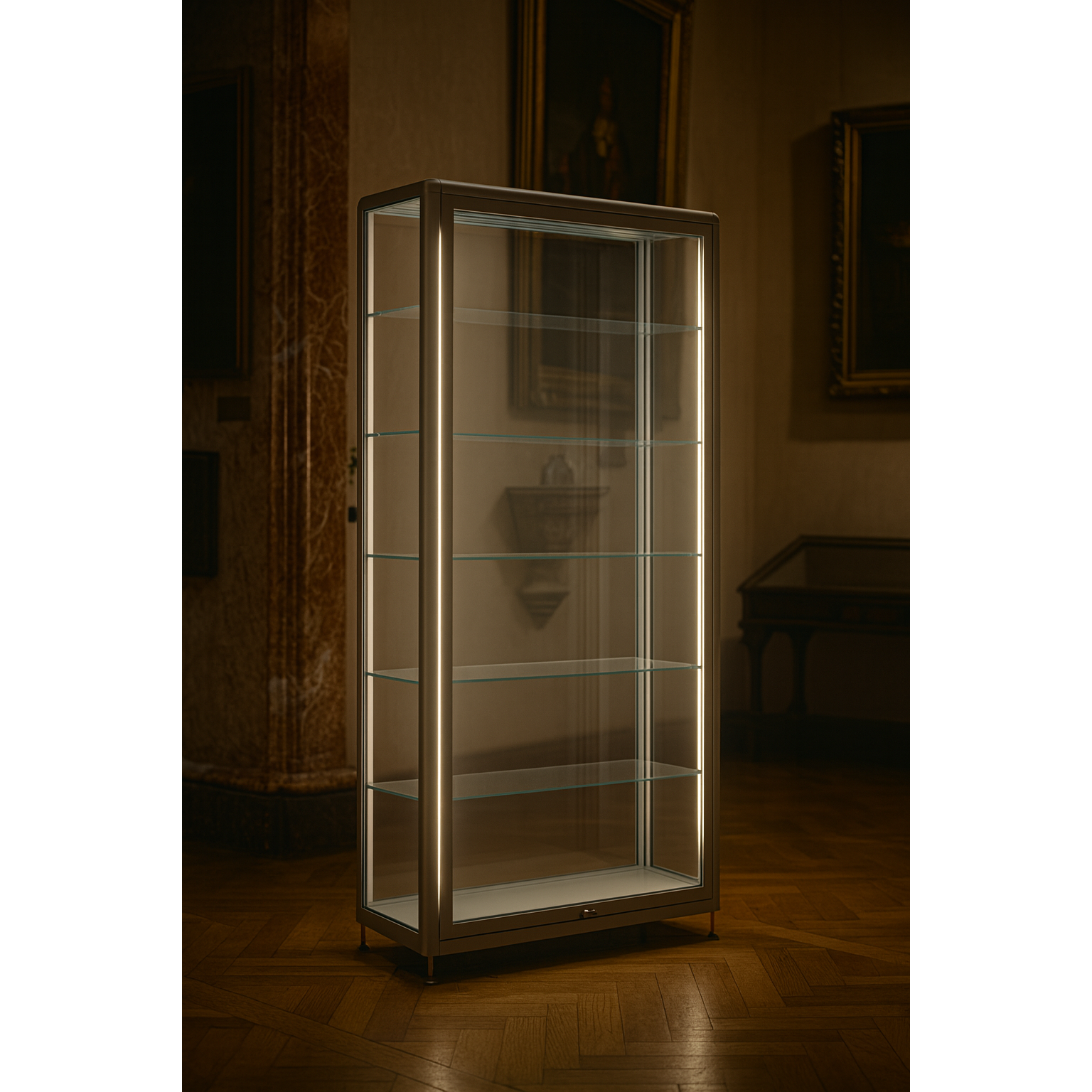 Oświetlenie gablot powinno być skierowane tak, by oświetlać całą powierzchnię równomiernie, bez cieni. Popularnym rozwiązaniem są oprawy montowane na górnej części gablot lub profile LED wpuszczane, które ukrywają źródło światła i rozpraszają je przez mleczne osłony dla efektu miękkiego, równomiernego światła.